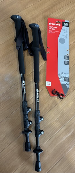 山登りを手助けしてくれる靴、服装、ストック、くくりつけ紐などを準備してそこそこ本格的な感じで突入しました。