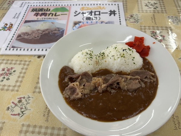お米の形が筑波山仕様になっています。中辛でやわらかお肉と美味しく食べれました。
